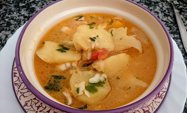 En una cazuela a ser posible de hierro fundido o barro, poner fondo de aceite, dorar los ajos y los aros de cebolla, después incorporar el tomate, añadir el moscatel seco y los cachelos, añadir el caldo de la cocción y dejar diez minutos, hasta que las patatas estén tiernas. Incorporar la guindilla, el pescado desmenuzado y el perejil fresco picado. Rectificar de sal.