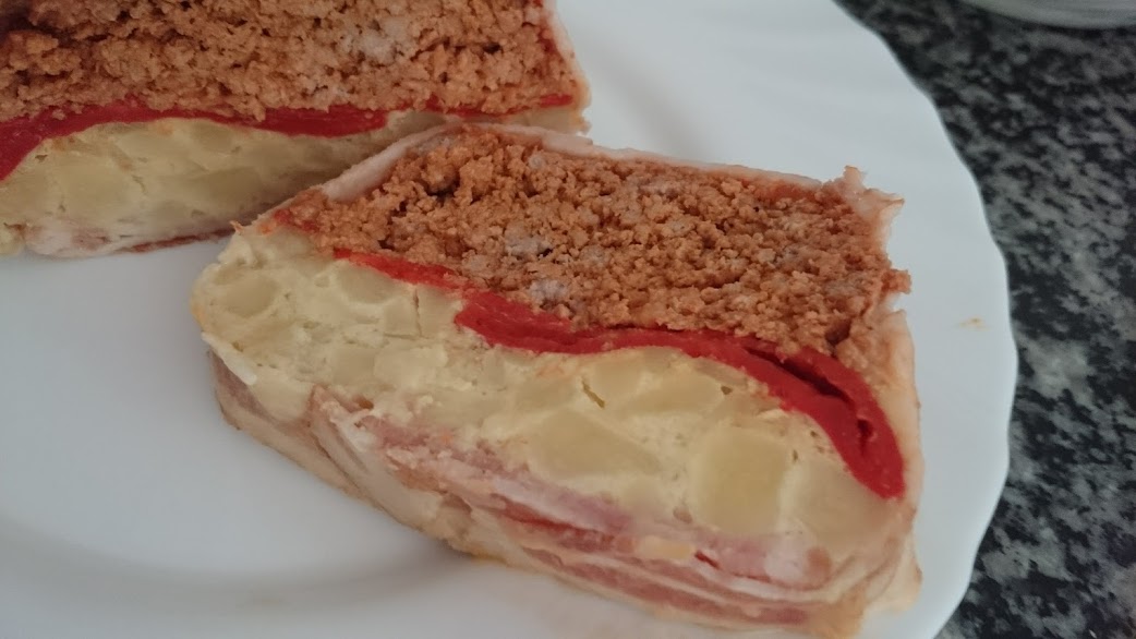 En un molde rectangular de horno, lo primero que hacemos es engrasarlo con un poco de AOVE. Colocar las lonchas de beicon sobre la base dejando que cuelguen por los lados, para luego cubrir y rodear el pastel. En un cuenco mezclar la carne picada con el tomate frito y un poco de sal. Encima colocar las lonchas de queso, después una capa de pimientos del piquillo enteros y por ultimo una mezcla de cuadritos de patatas con cebolla fritos y mezclados con huevo batido.Cubrir con el beicon e introducir en el horno 45 minutos a 180ºC.