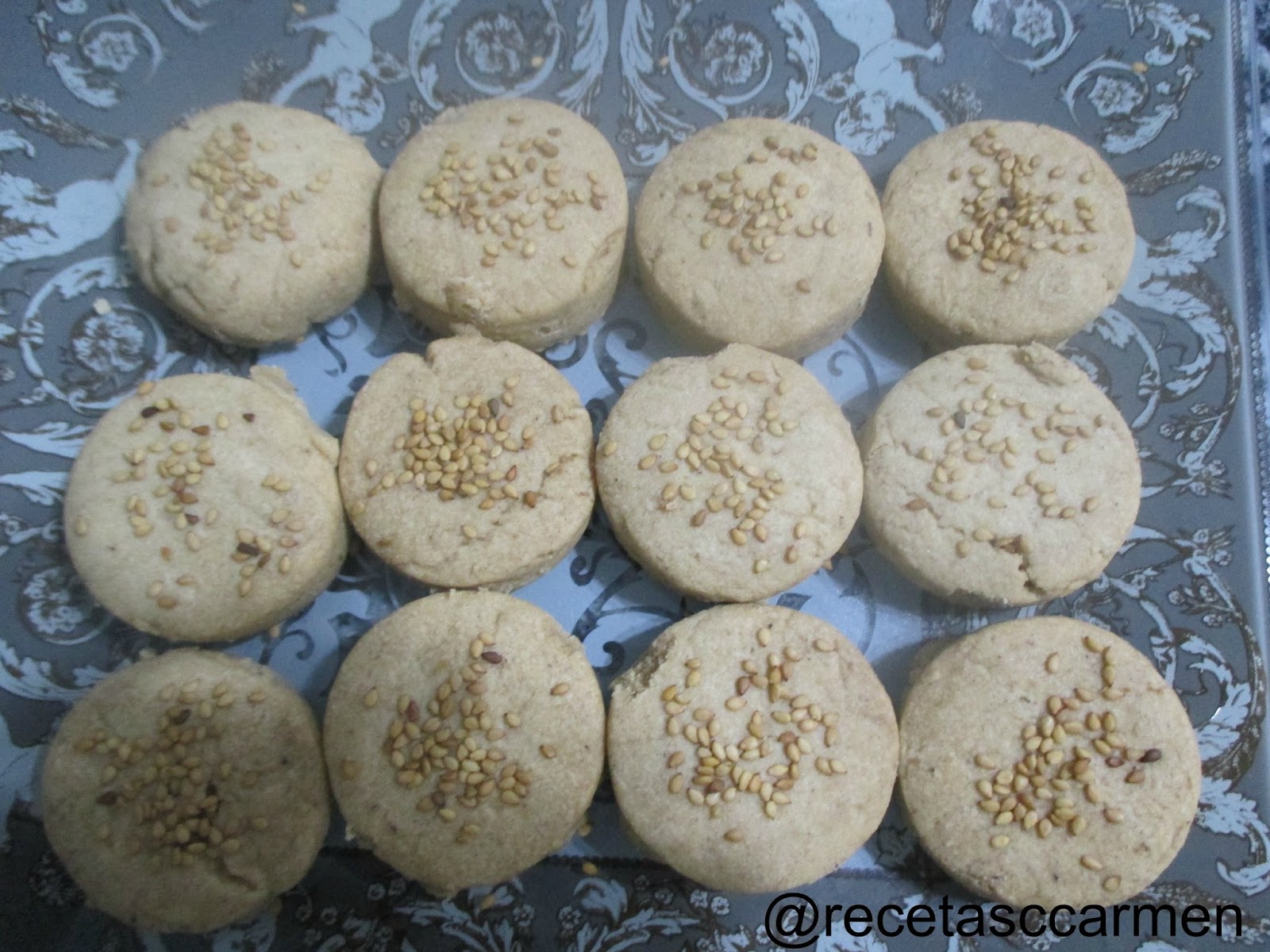 Amasar con el rodillo la masa reposada, estirándola hasta dejarla con 1 dedo aproximado de grosor. Cortar círculos de masa y disponerlos en una bandeja de horno cubierta con papel vegetal ligeramente engrasado. Decorar con ajonjolí por encima.