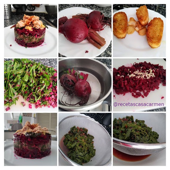 La remolacha, como ya comenté en alguna entrada antigua, es la raíz de una planta la "Beta vulgari" de color rojo morado intenso, de forma redondeada cuyo peso es variable , oscilando mas o menos en 100 gramos. Aunque no es lo habitual, las hojas y el tallo también son aptos para el consumo humano. Y esto es lo que hoy quiero recalcar, la utilización de las hojas en un estupendo esparragado, "esparragao", como se dice en mi Málaga.