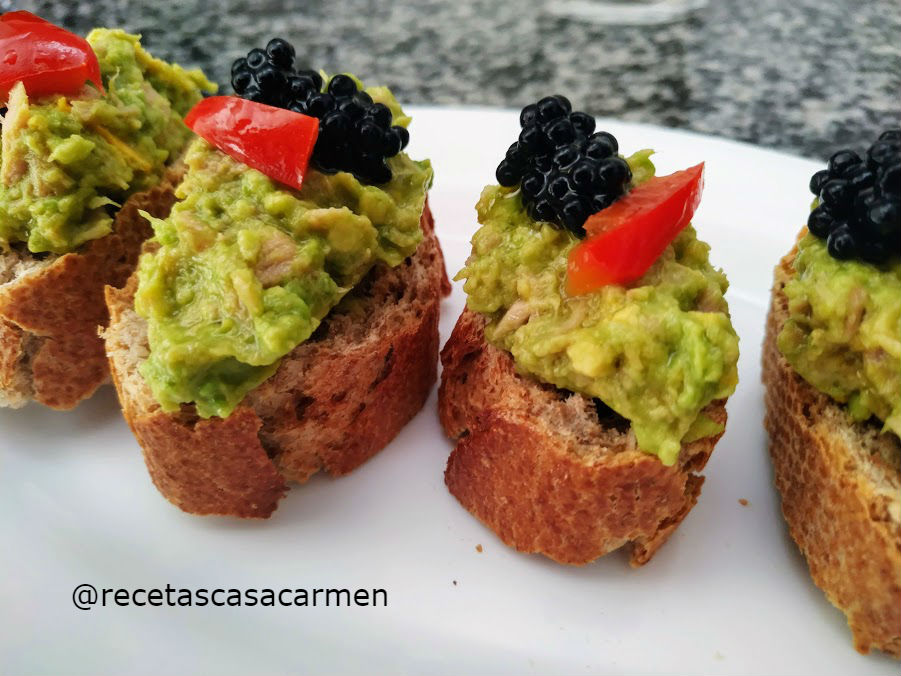 En las rebanadas de pan integral, que tostamos, poner la pasta de aguacate, decorar con la huevas de lumpo y un poco de pimiento morrón.