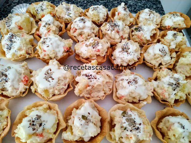 Estas son cazuelitas hechas con obleas de empanadillas, previamente horneadas y después rellenas de ensaladilla rusa: patatas, zanahoria, atún, gambitas cocidas, un pelin de cebolla y ralladura de limón, mayonesa y semillas.