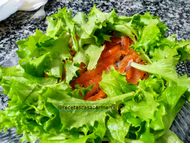 Brotes tiernos de lechuga con palitos de salmón marinado y un chorrito de AOVE. He marinado el salmón con una capa de sal para ahumados en la base y luego cubierto al 50% con sal y azúcar. 12 horas en nevera a 4 ºC.
