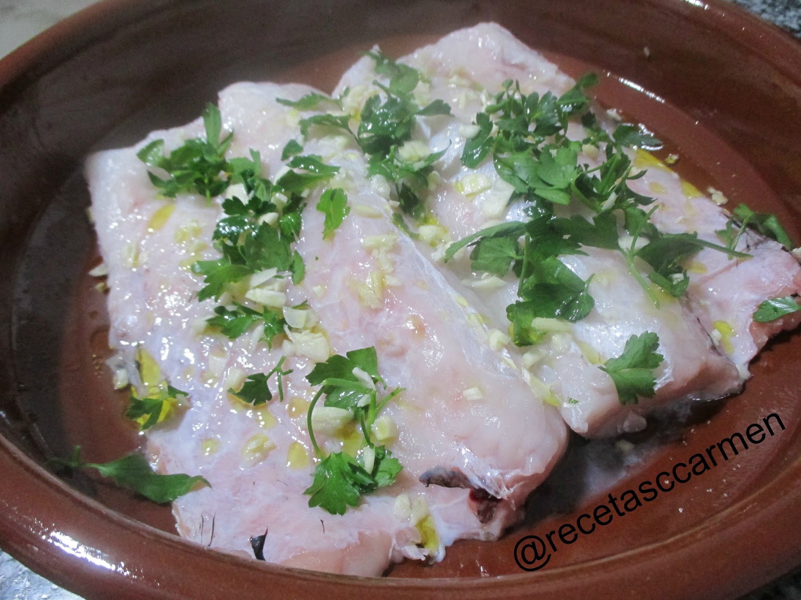 Quitar las escamas y quitar la espina central.Abrir los lomos en una fuente de horno aderezar con la sal el zumo entero del limón, losajitos picaditos y el perejil.Añadir un chorrito de AOVE.