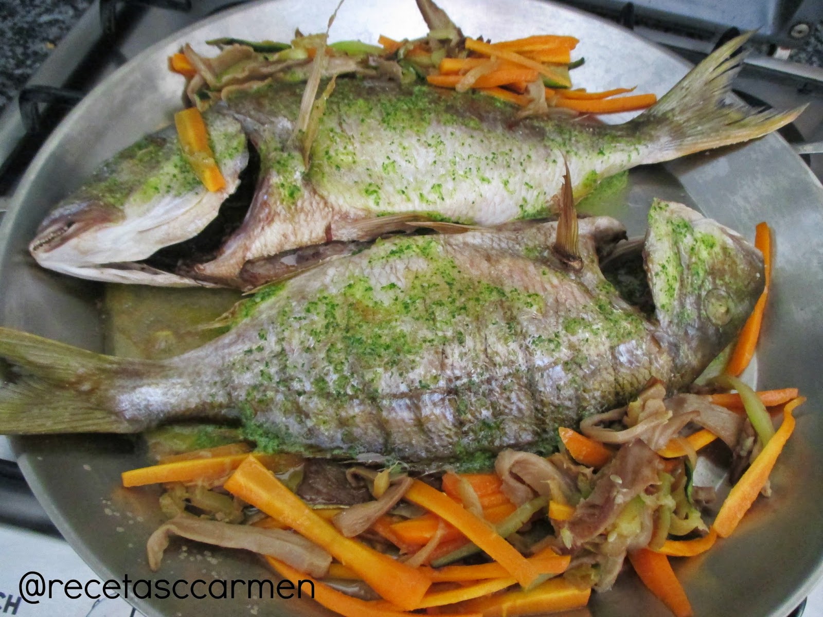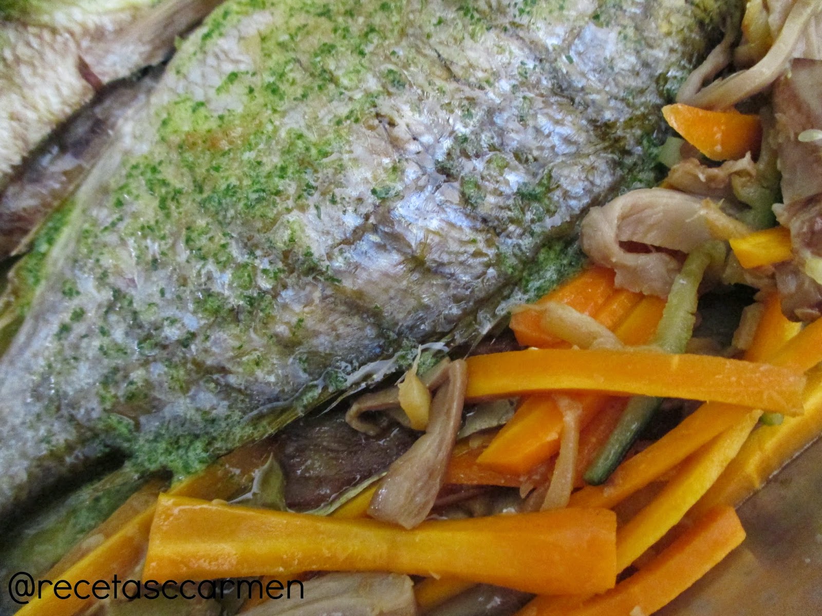 Es un lujo encontrar en la pescadería, herreras de diversos tamaños con ojos alegres y vivos, esto es indicativo de pescado salvaje, por el contrario podemos encontrar una serie de pescados de igual tamaño con ojos no tan alegres, en perfecto estado de revista, estas son de piscifactoría.Tuve la suerte de encontrar estos peces en estado salvaje.Pesaron las dos 1500 gramos, las puse al horno acompañadas de unas verduritas salteadas, vuelta y vuelta, os cuento como.