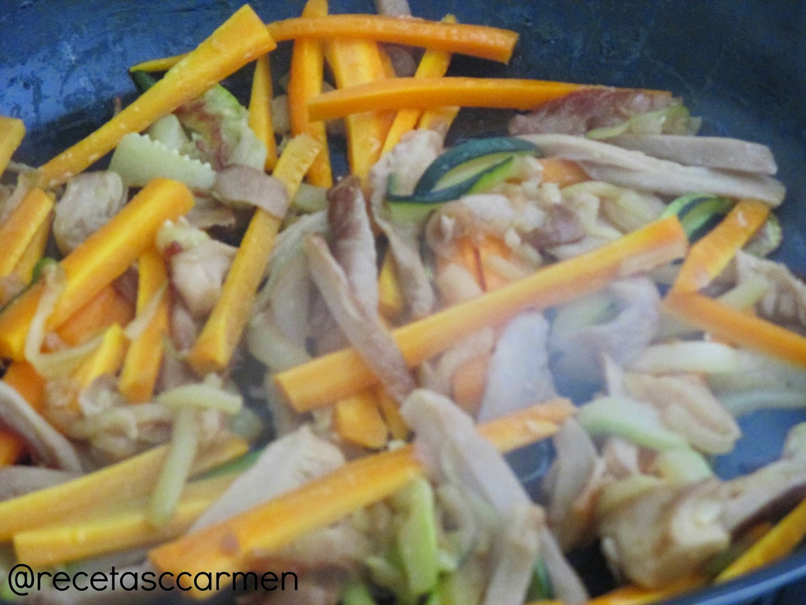 En una sartén con fondo de AOVE añadir las verduras en tiras hasta que estén al dente.