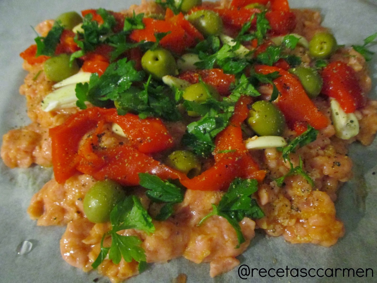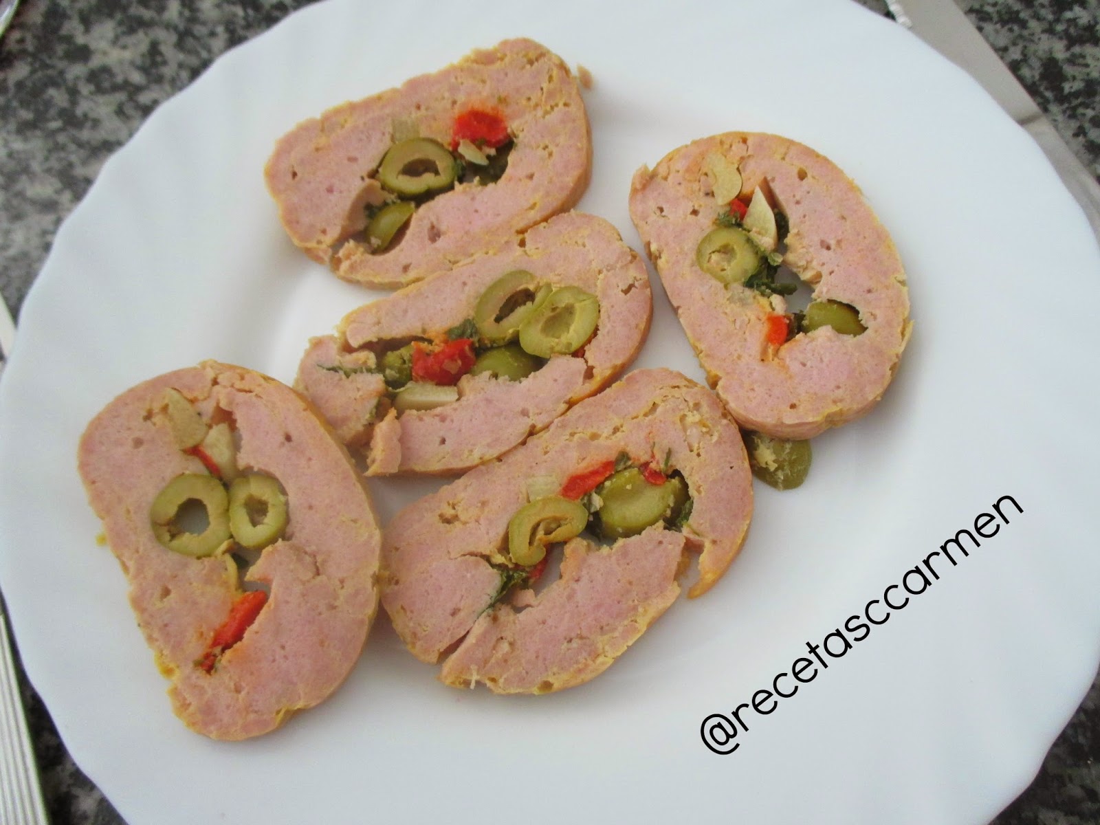 Mezclar la carne con el huevo. Sobre un papel de horno colocar la carne en forma de una plancha de unos 1,5 cm de grosor. Lavar debajo del grifo el pimiento y las aceitunas. Poner sobre la carne el resto de ingredientes , el pimiento a tiras. Añadir sal con precaución pues las aceitunas ya las tiene. Con ayuda del papel de la base hacer un rollo y envolver. Aplicar presión por los extremos como si se tratara de un caramelo. Depositar en una bandeja de horno. Introducir en el horno 35 minutos a 180ºC. Cortar a rodajas una vez frío.