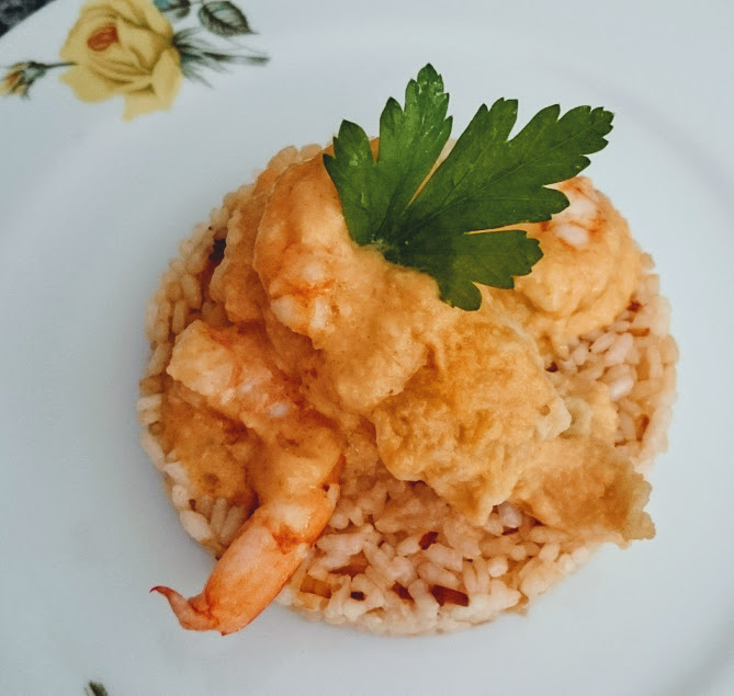 Aunque he seguido la receta tradicional la he acompañado de una base de arroz y unas gambitas para darle un aire mas de ahora sobre todo en la presentación del plato.